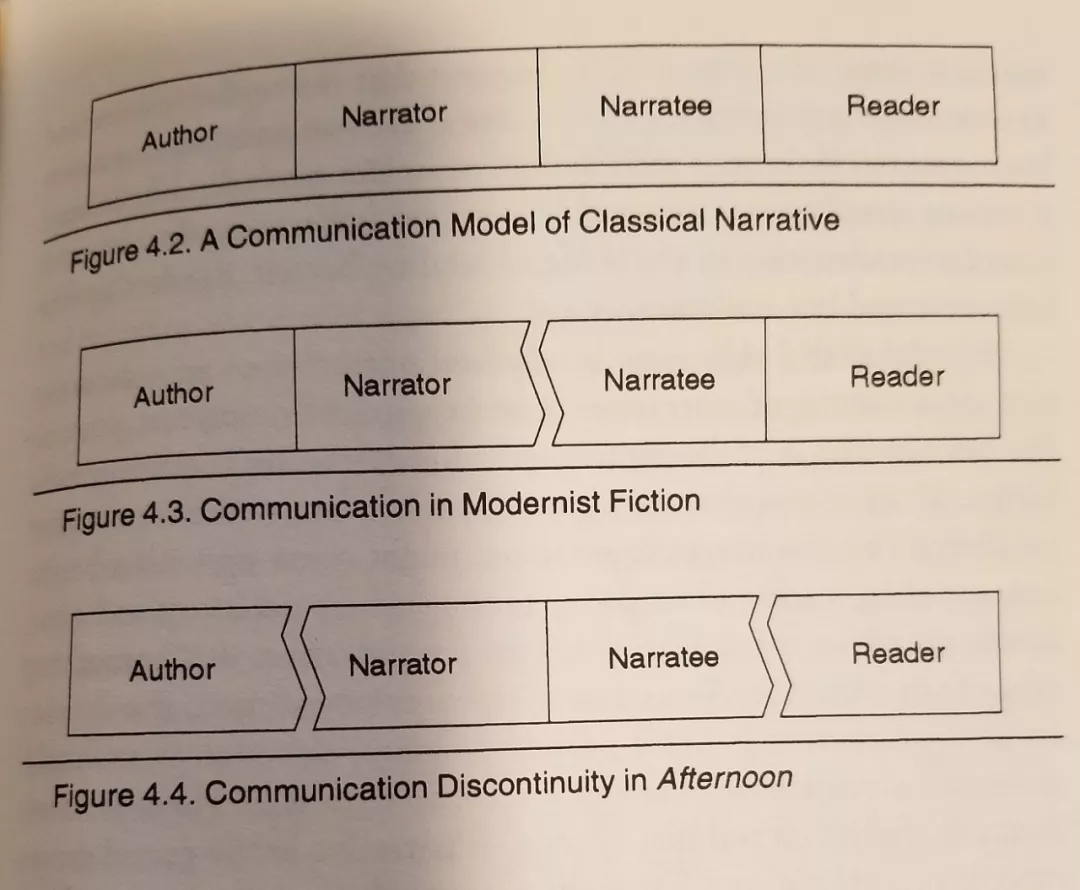 在afternoon, a story中,超文本技术作为一种修辞方法,给读者造成了一种在文本迷宫中找不到出路的迷惑感。在传统的基于纸质书的小说中,有时候作者也会使用种种修辞方法刻意造成读者的迷惑感。